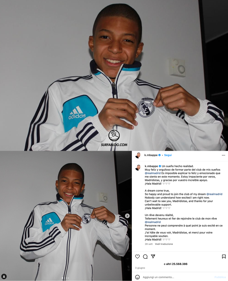 Il post pubblicato il 3 Giugno annuncia il trasferimento di Kylian Mbappé al Real Madrid. Lo scatto ha superato i 25,5 milioni di like (per vederlo clicca qui).