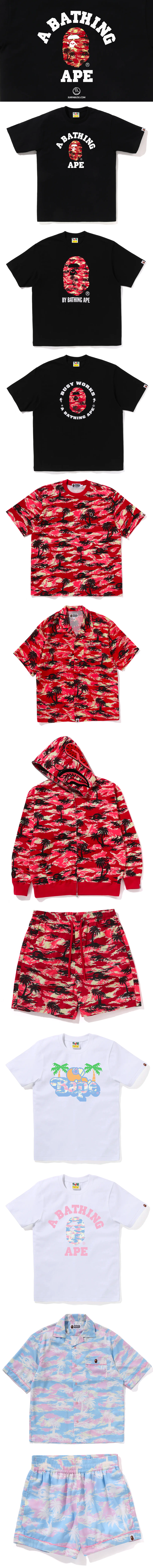 La capsule è composta da: Palm Tree Camo College Tee, Palm Tree Camo By Bathing Ape Relaxed Fit Tee, Palm Tree Camo Busy Works Sta Relaxed Fit Tee, Palm Tree Camo One Point Relaxed Fit Tee, Palm Tree Camo Relaxed Fit Shark Full Zip Hoodie, Palm Tree Camo Open Collar Pocket SS Shirt, Palm Tree Camo Relaxed Fit Beach Shorts, Palm Tree Pattern Milo On Bape Tee, Palm Tree Camo College Tee, Palm Tree Camo Open Collar Shirt, Palm Tree Camo Shorts.