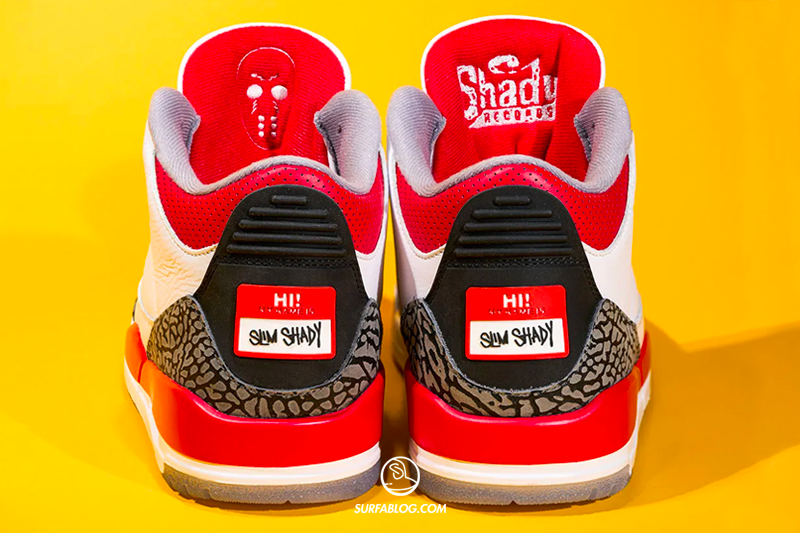 Ad un primo sguardo può sembrare una AJ 3 “Fire Red”, ma grazie alle foto di English Sole, si notano dei dettagli incredibili. Sul tallone è presente il logo “Hi! My Name Is Slim Shady”. All’interno delle linguette c’è il logo della maschera e quello della Shady Records. Nelle solette c’è la scritta “EMINEM”.