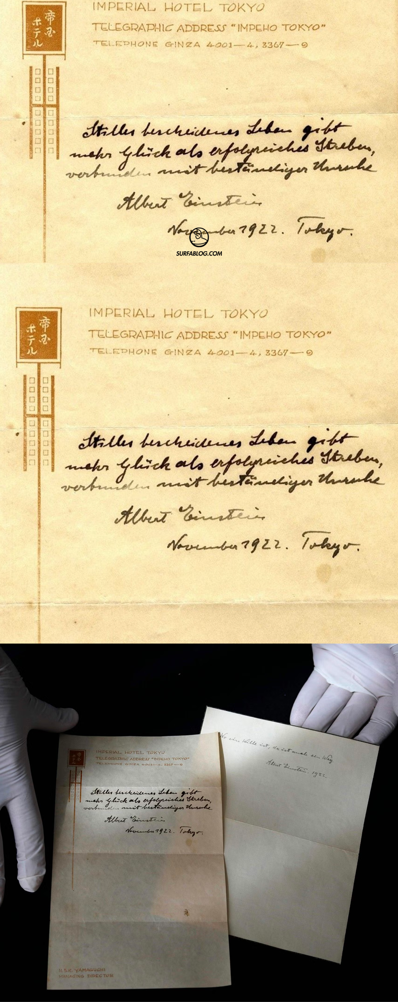 Durante il suo soggiorno con la moglie Elsa in albergo, un corriere si presentò nella loro stanza per effettuare una consegna. Come mancia, lo scienziato gli lasciò questo foglio con scritto “Una vita calma e modesta, porta più felicità della ricerca del successo combinata ad una costante irrequietezza. Volere è potere”.