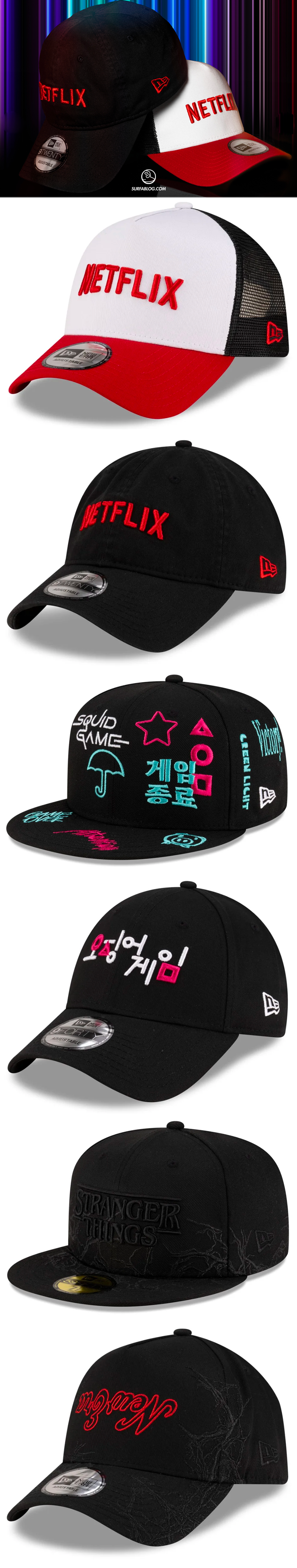 La collezione è composta da: 9FOFRTY Netflix, 9TWENTY Netflix, 59FIFTY Squid Game, 9FORTY Squid Game, 59FIFTY Stranger Things, 9FORTY Stranger Things.