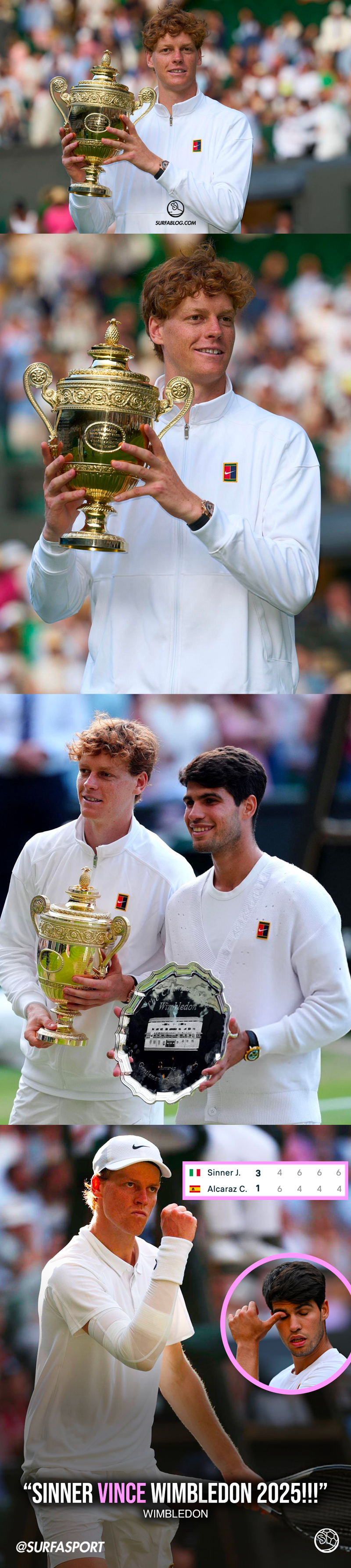 Jannik Sinner ha trionfato a Wimbledon, battendo in 4 set Carlos Alcaraz con il parziale di 4-6, 6-4, 6-4, 6-4.