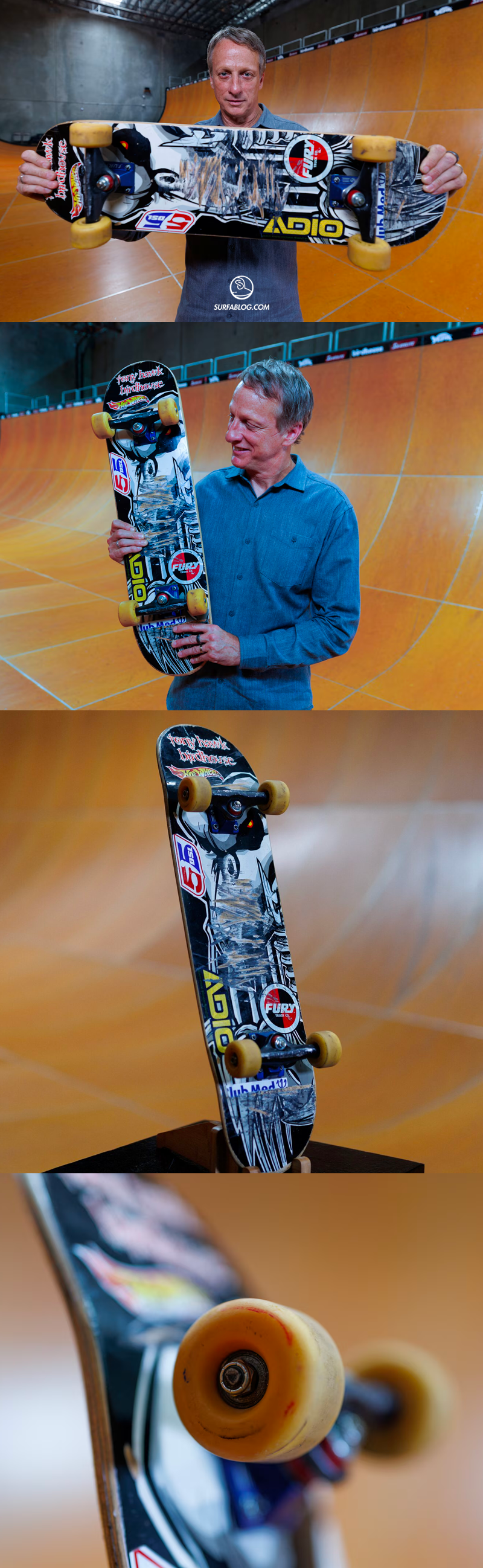 Tutti i proventi andranno a sostegno di “The Skatepark Project”, associazione no-profit di Hawk, che costruisce skatepark in aree svantaggiate. Lo skateboard era un Birdhouse “Falcon 2”.