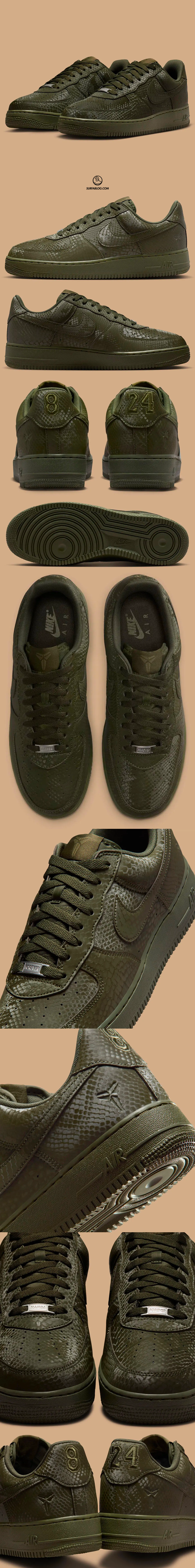 Si tratta della 10ma AF1 che Nike ha dedicato a Kobe. La scarpa è nella colorazione “Cargo Khaki” e presenta una tomaia che ricorda la pelle del serpente.